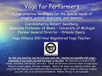 YFP was developed by Robert Swedberg in 2003 as an outgrowth of many years training singing-actors. Focusing on the aspects of yoga that might be best incorporated into that training, the practice features asanas for flexibility, strength building, balance and coordination, with breath and mindfulness being central attributes.